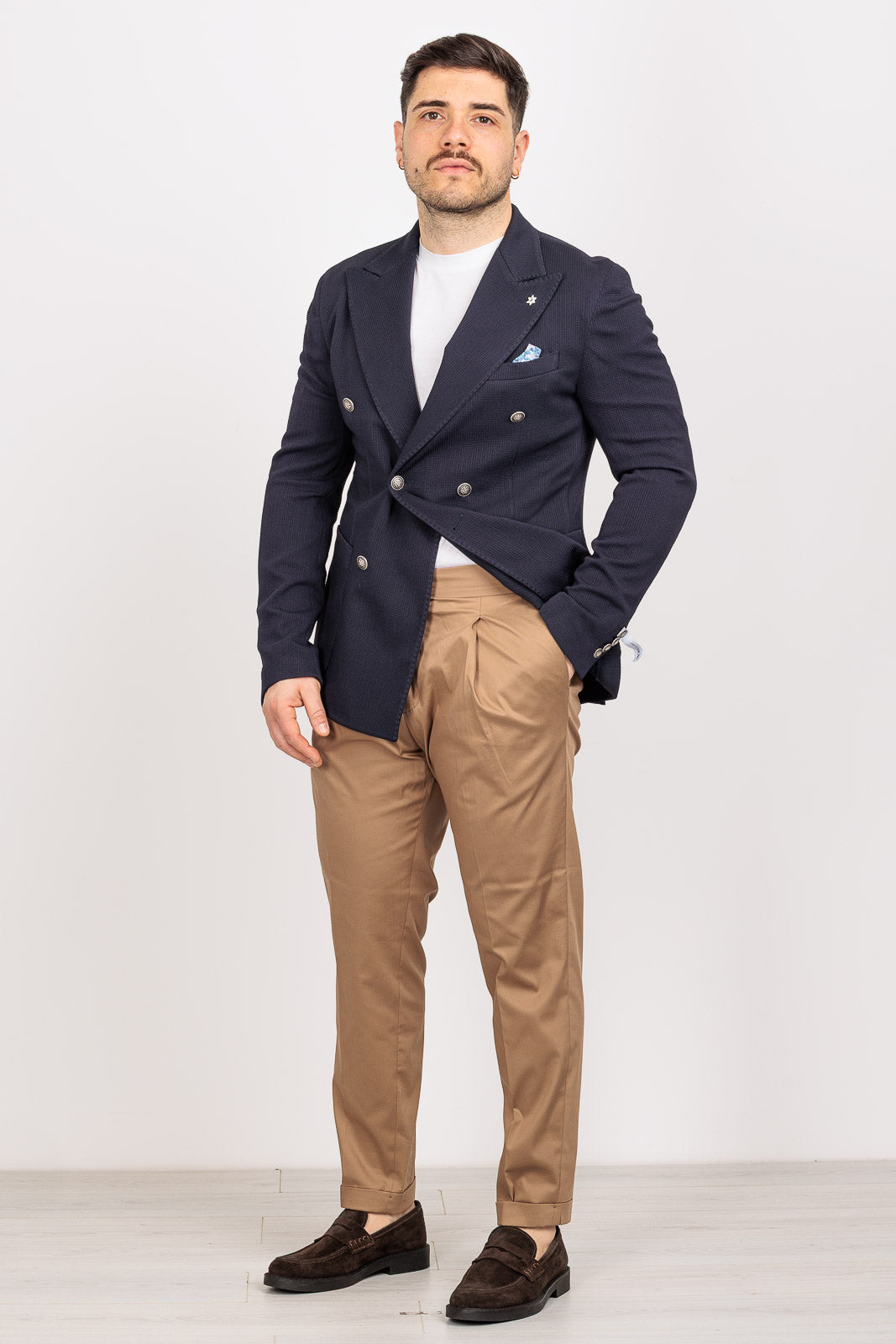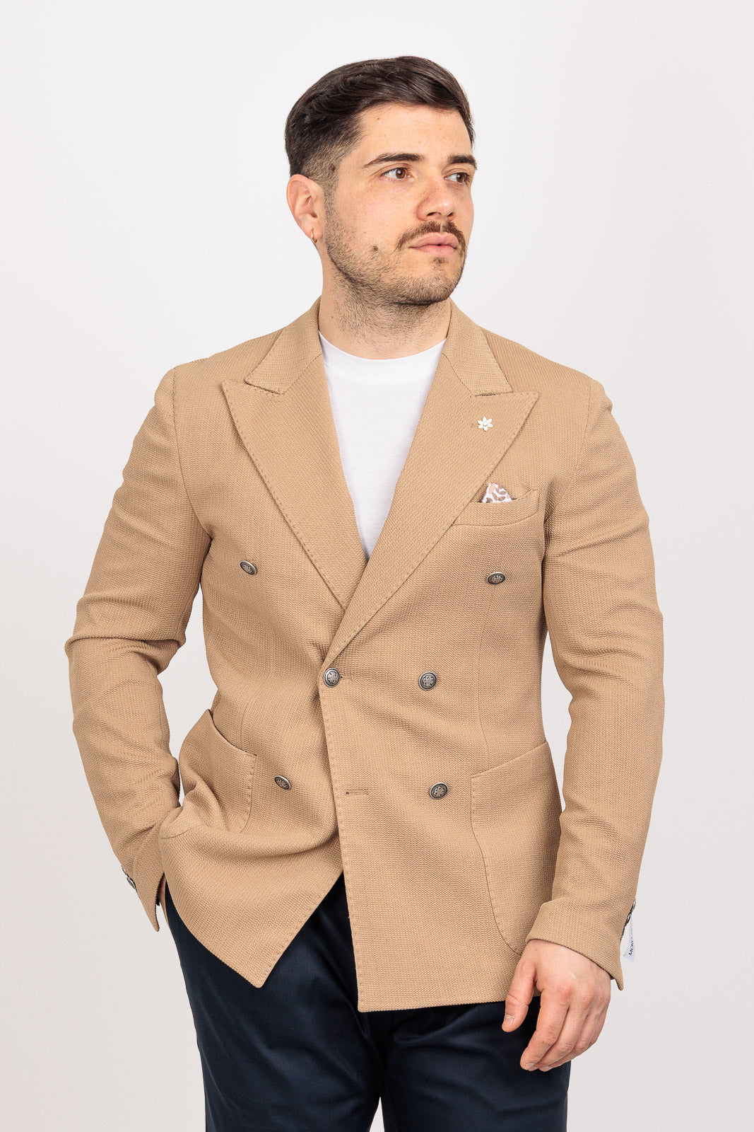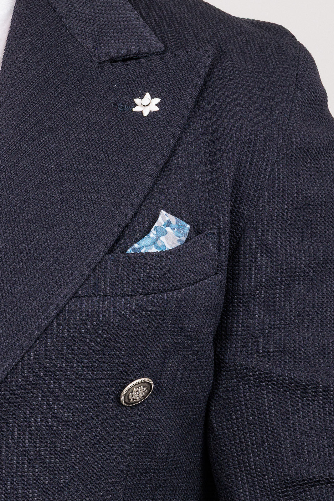 La costruzione è sfoderata e leggera, ideale per affrontare cerimonie ed eventi estivi con il massimo comfort termico. Il dettaglio della tasca a toppa "smorza" la formalità del doppiopetto, permettendoti di indossarlo con disinvoltura anche sopra un denim o un pantalone chino sportivo.