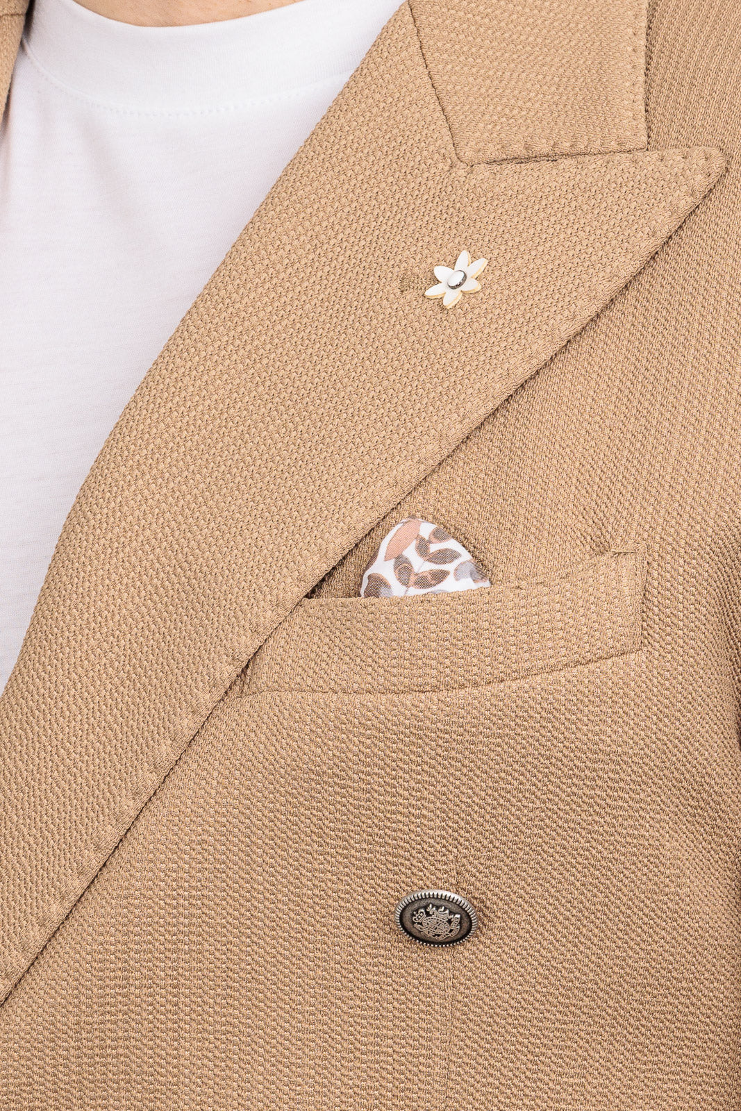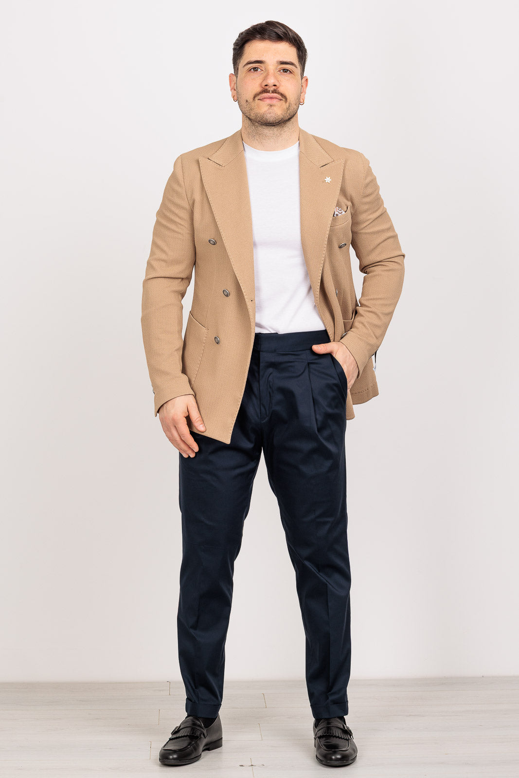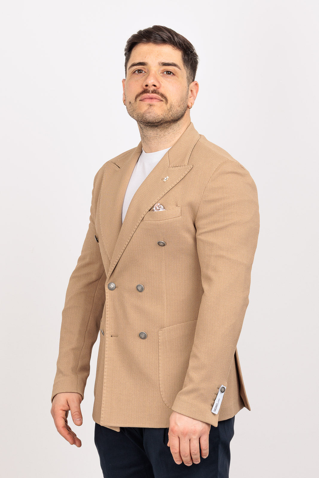 La costruzione è sfoderata e leggera, ideale per affrontare cerimonie ed eventi estivi con il massimo comfort termico. Il dettaglio della tasca a toppa "smorza" la formalità del doppiopetto, permettendoti di indossarlo con disinvoltura anche sopra un denim o un pantalone chino sportivo.