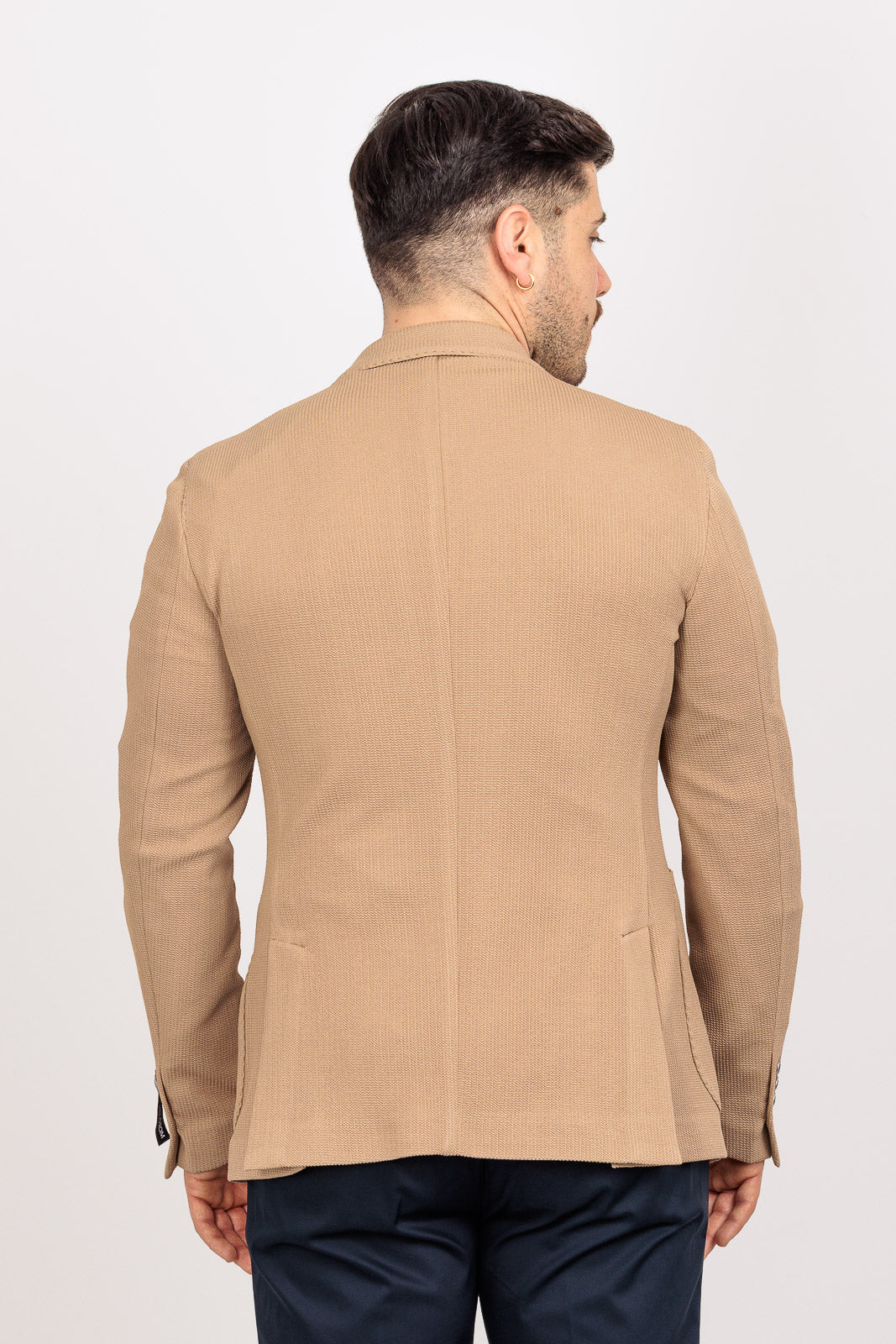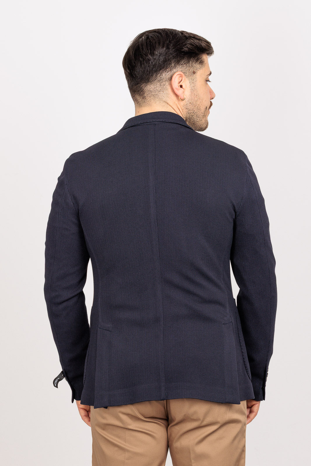 Il punto di forza è il tessuto armaturato leggero: una trama strutturata che regala alla giacca una consistenza visiva ricca e tridimensionale, pur mantenendo una leggerezza incredibile. I bottoni in metallo a contrasto richiamano lo stile "navy" e accademico, donando un tocco di prestigio. Grazie alla composizione tecnica stretch (95% PL, 5% EA), la giacca offre una vestibilità slim fit impeccabile che segue i movimenti senza mai stringere, restando praticamente antipiega.