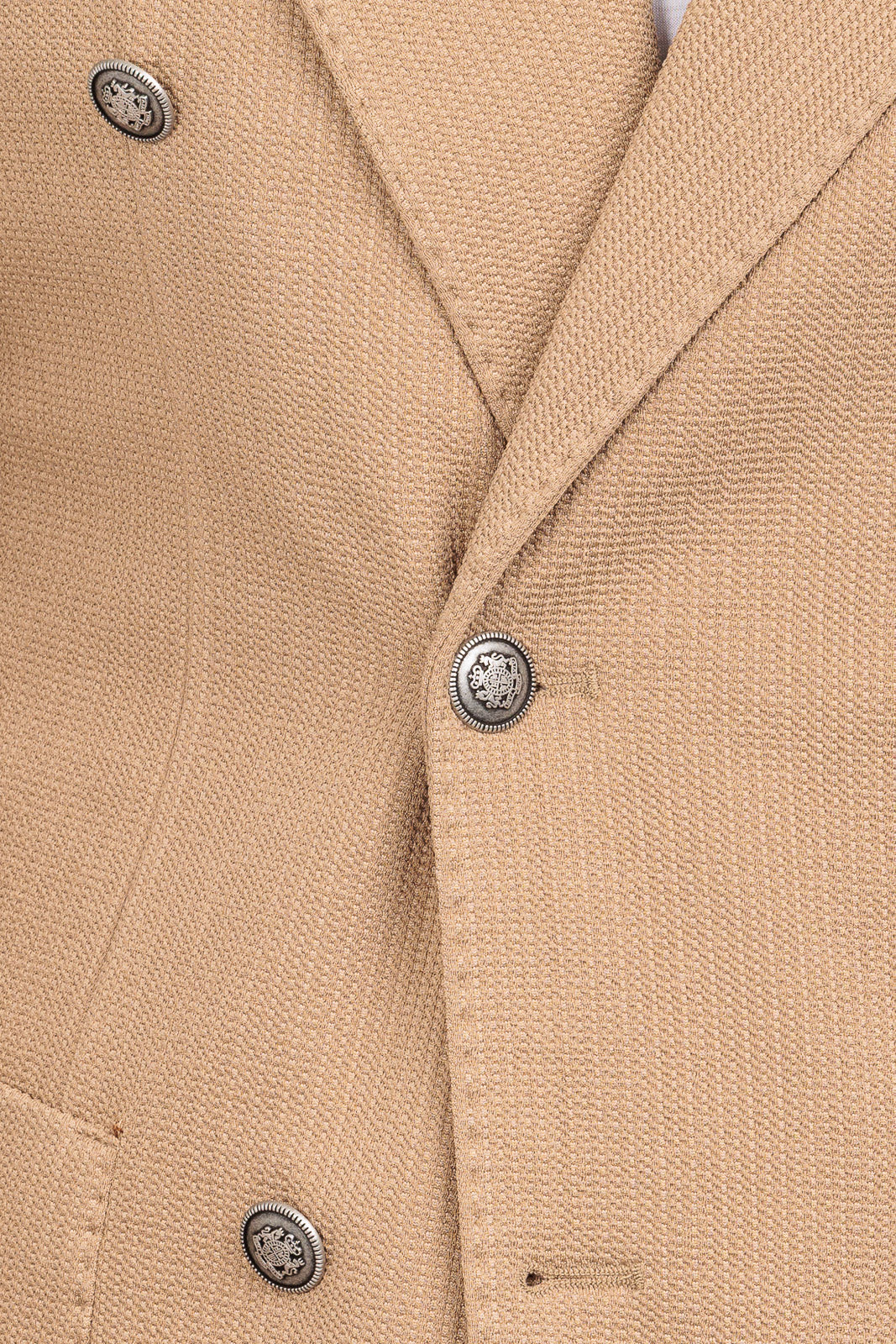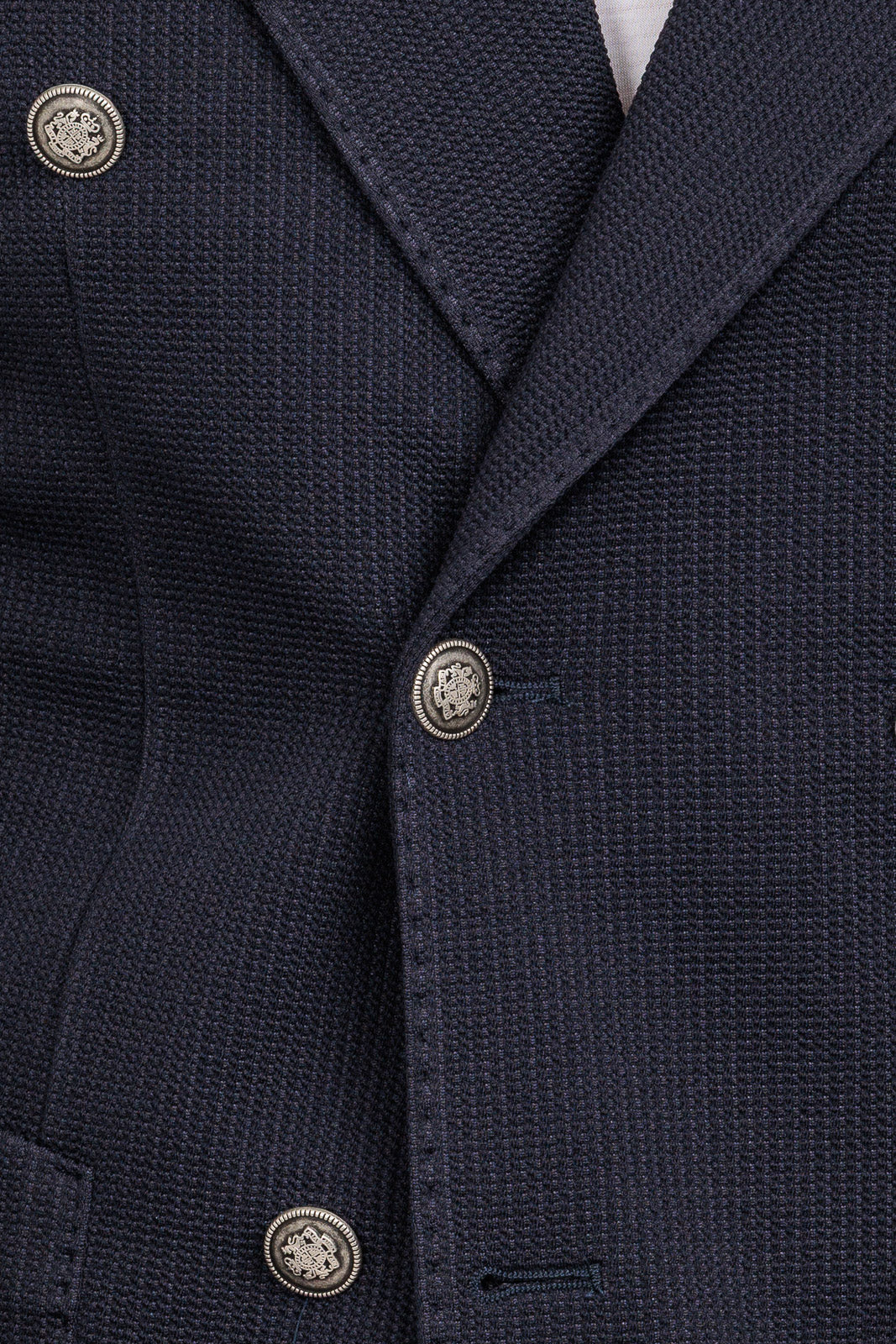 Dettagli Iconici: Bottoni metallici con stemma, revers a lancia.