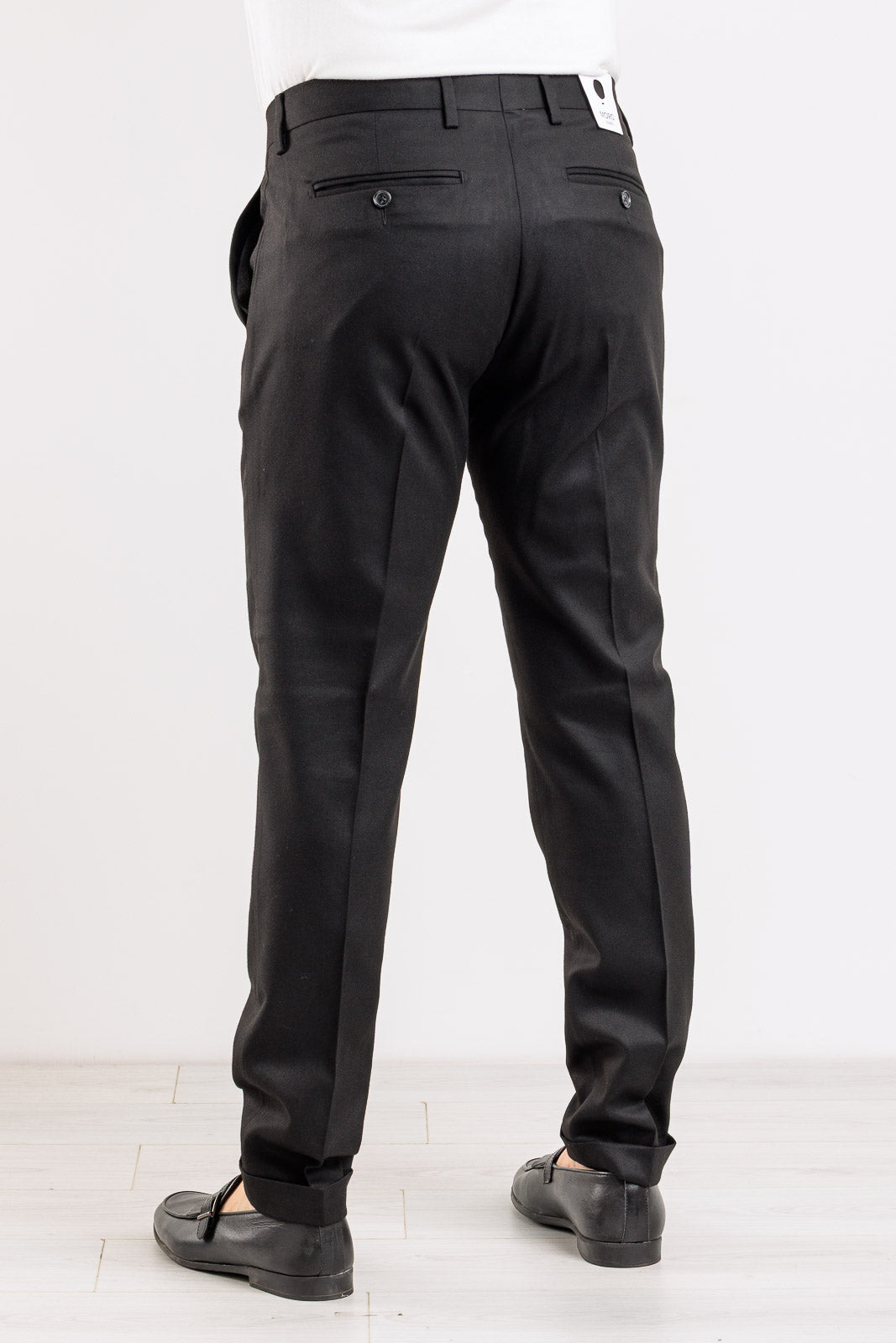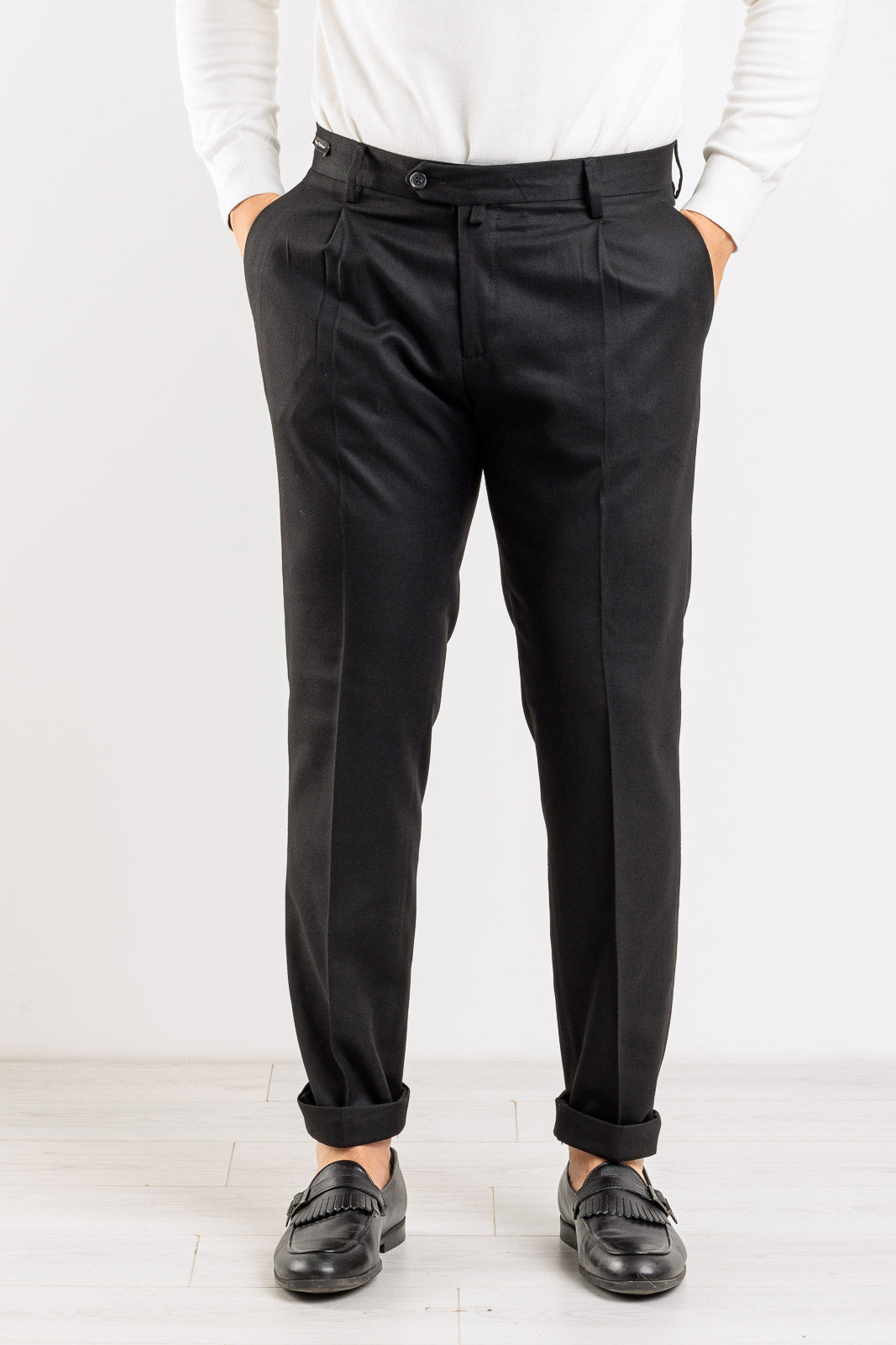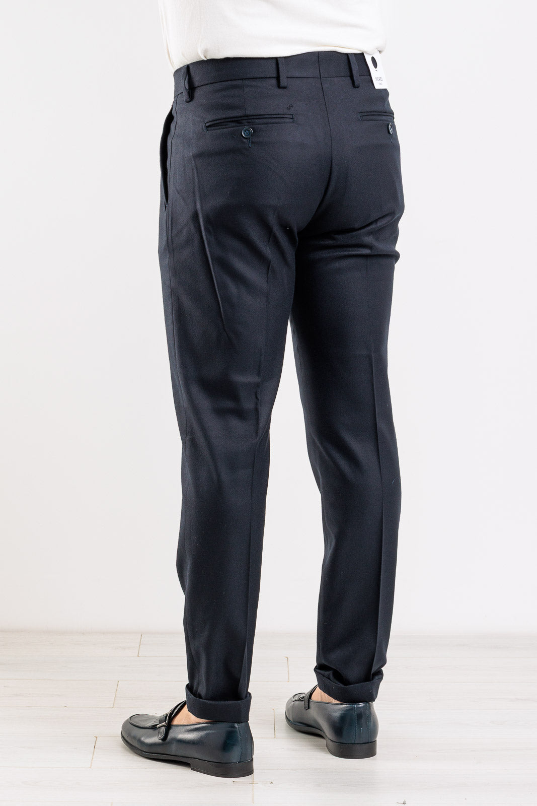 Un pantalone che incarna l'eccellenza della sartoria italiana, ideale per la collezione Autunno/Inverno. Interamente Made in Italy, questo capo in tinta unita è un must-have per la sua eleganza senza tempo e il taglio impeccabile. Il design è curato nei minimi dettagli, con l'aggiunta di due pinces sul davanti che conferiscono volume e un look raffinato. È dotato dell'intramontabile tasca America sul davanti e di tasche a filetto con bottone sul retro. La vestibilità slim assicura una silhouette asciutta e moderna che valorizza la figura con eleganza.