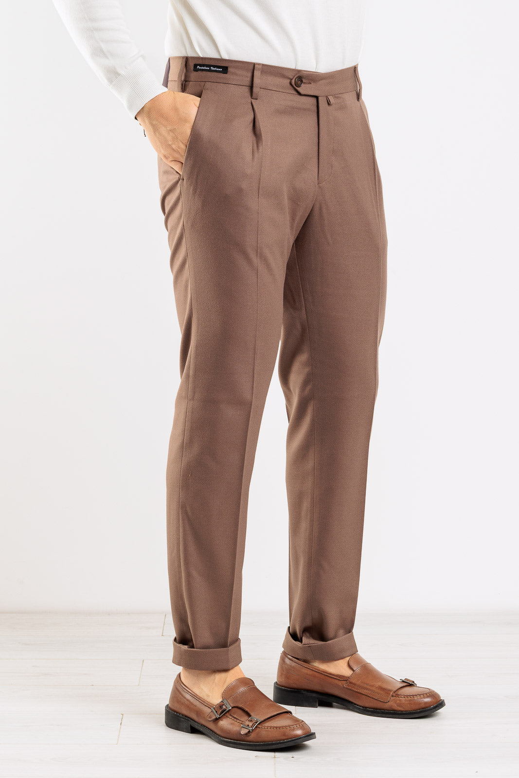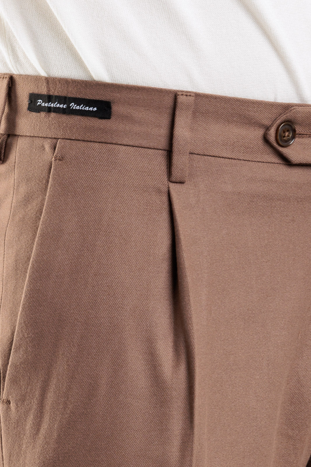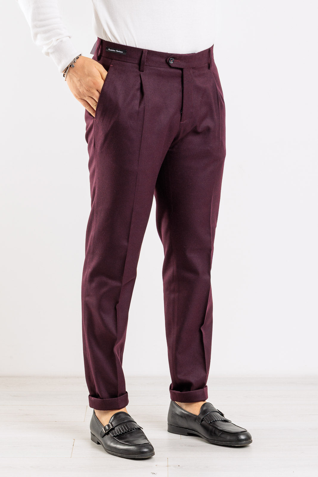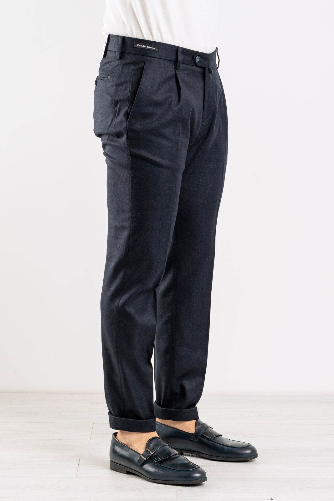 Un pantalone che incarna l'eccellenza della sartoria italiana, ideale per la collezione Autunno/Inverno. Interamente Made in Italy, questo capo in tinta unita è un must-have per la sua eleganza senza tempo e il taglio impeccabile. Il design è curato nei minimi dettagli, con l'aggiunta di due pinces sul davanti che conferiscono volume e un look raffinato. È dotato dell'intramontabile tasca America sul davanti e di tasche a filetto con bottone sul retro. La vestibilità slim assicura una silhouette asciutta e moderna che valorizza la figura con eleganza.