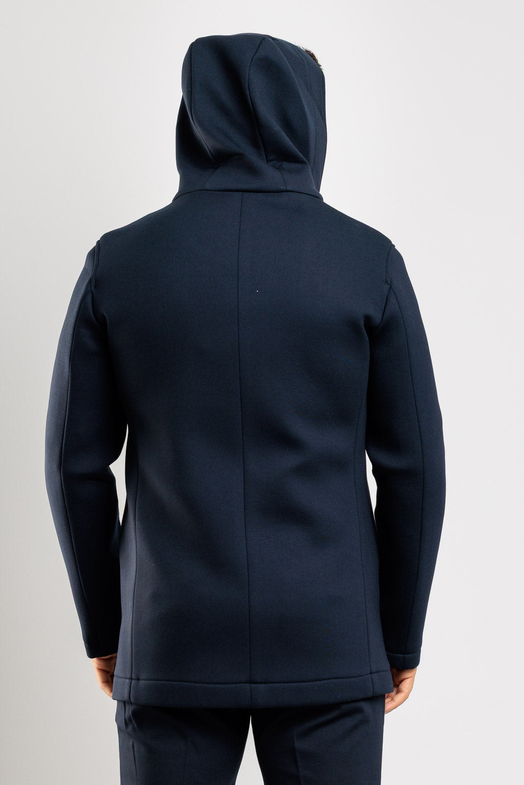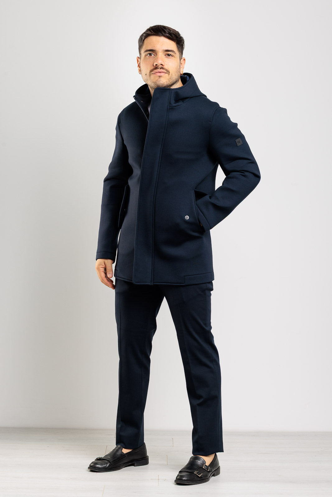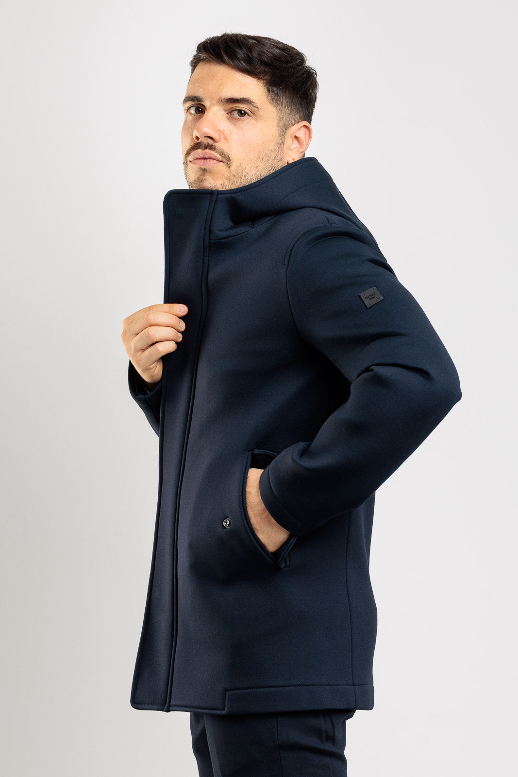 Un capo che coniuga l'eleganza strutturata di un giaccone all'eccezionale comfort del jersey, perfetto per la collezione Autunno/Inverno. Questo giubbotto da uomo, interamente Made in Italy, è realizzato in pregiato tessuto Punto Milano imbottito, che garantisce calore, ottima tenuta e una mano morbida, distinguendosi dai tessuti tecnici tradizionali. Il design presenta un pratico cappuccio e una doppia chiusura con zip e bottoni a clip, per la massima protezione e versatilità. È dotato di due tasche esterne, ideali per riporre i tuoi effetti personali. Ideale per chi cerca un capospalla caldo ma con un tocco sofisticato.
