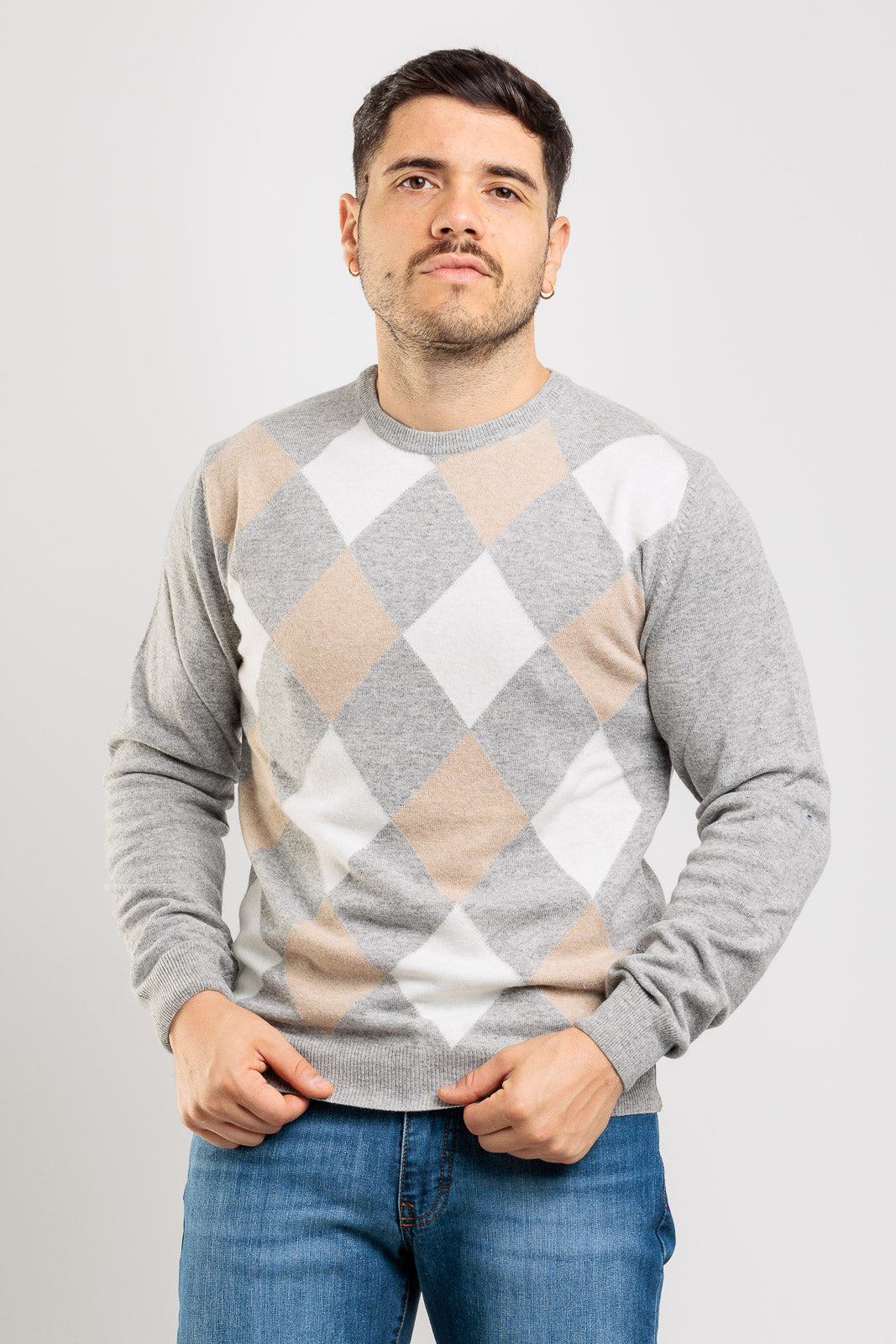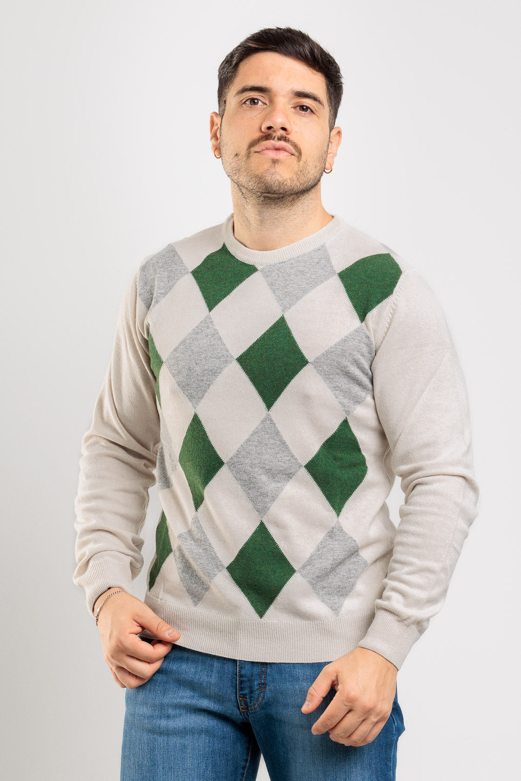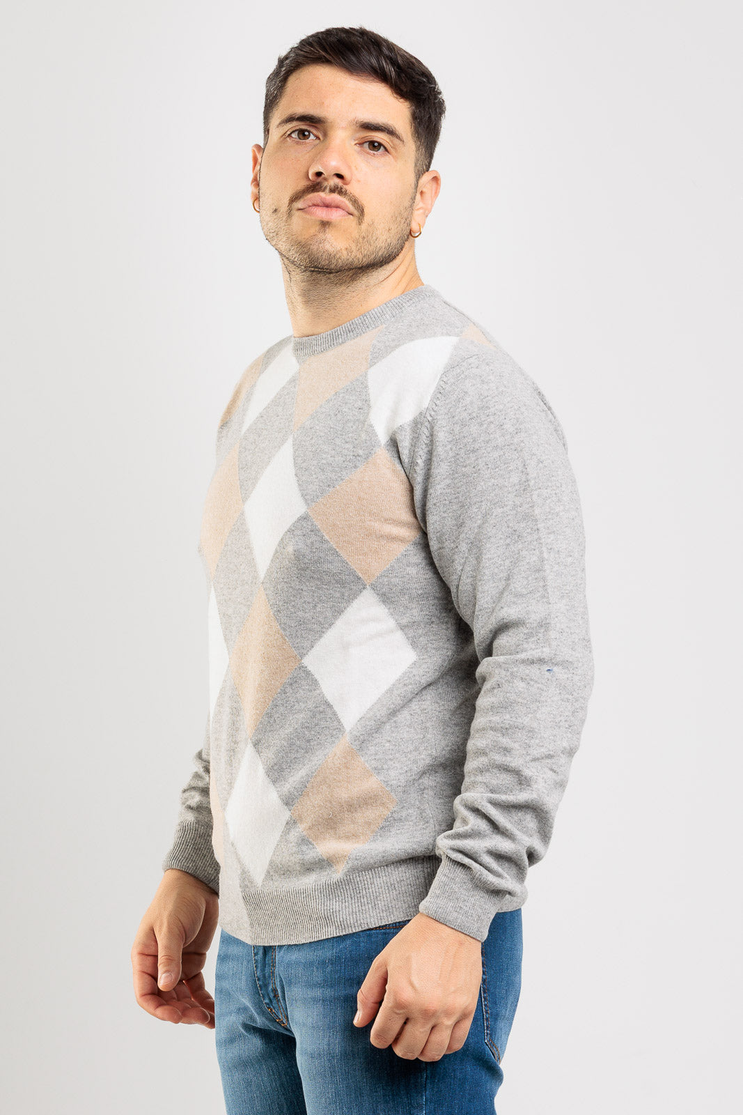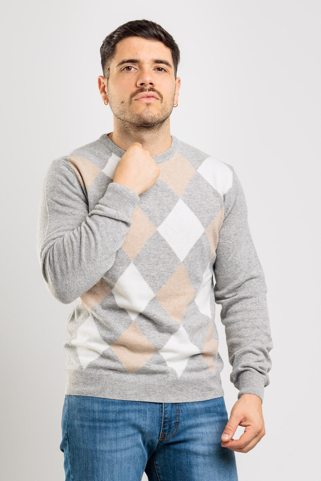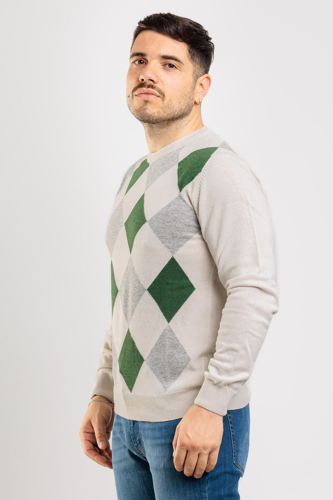 Un maglioncino elegante e sofisticato, perfetto per la collezione Autunno/Inverno, che unisce il comfort di un capo casual alla raffinatezza sartoriale del Made in Italy. Questa maglia a girocollo è realizzata in un pregiato misto di cotone e cashmere, offrendo calore, morbidezza e una sensazione piacevole sulla pelle. La distintiva fantasia a rombi aggiunge un tocco di stile classico e intramontabile. Il design è rifinito con un pratico elastico su polsi e fondo, che assicura una vestibilità ottimale e una maggiore tenuta.