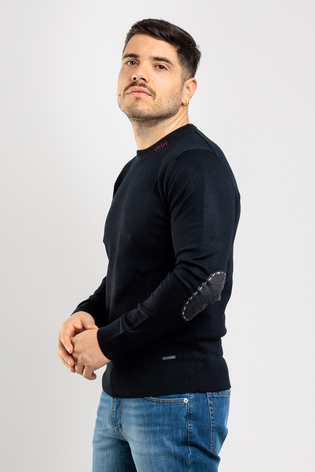 Un maglione da uomo essenziale ma con un dettaglio distintivo, perfetto per la collezione Autunno/Inverno. Questa maglia a girocollo è realizzata in morbido tessuto in tinta unita, un capo facile da abbinare. Il design è impreziosito da eleganti toppe sui gomiti in colore a contrasto, che aggiungono un tocco classico e ricercato. Il modello è rifinito con un pratico elastico su polsi e fondo, che garantisce una vestibilità ottimale e una maggiore tenuta.