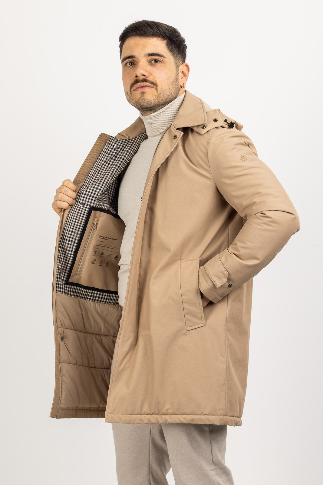 Questo spolverino/giaccone in tinta unita è realizzato in tessuto impermeabile (antipioggia), garantendo una protezione ottimale dagli agenti atmosferici con un look pulito e curato. Il design è estremamente versatile grazie al cappuccio, removibile con facilità, che permette di trasformare il capo da tecnico a elegante. La chiusura frontale è protettiva, con zip e patta coprente con bottoni a clip. Presenta due tasche esterne laterali. Il piccolo logo Manuel Ritz è applicato sulla manica, a certificare l'appartenenza al brand. La vestibilità regular assicura una linea comoda e un comfort ottimale, ideale per essere indossato sopra una giacca o un maglione.
