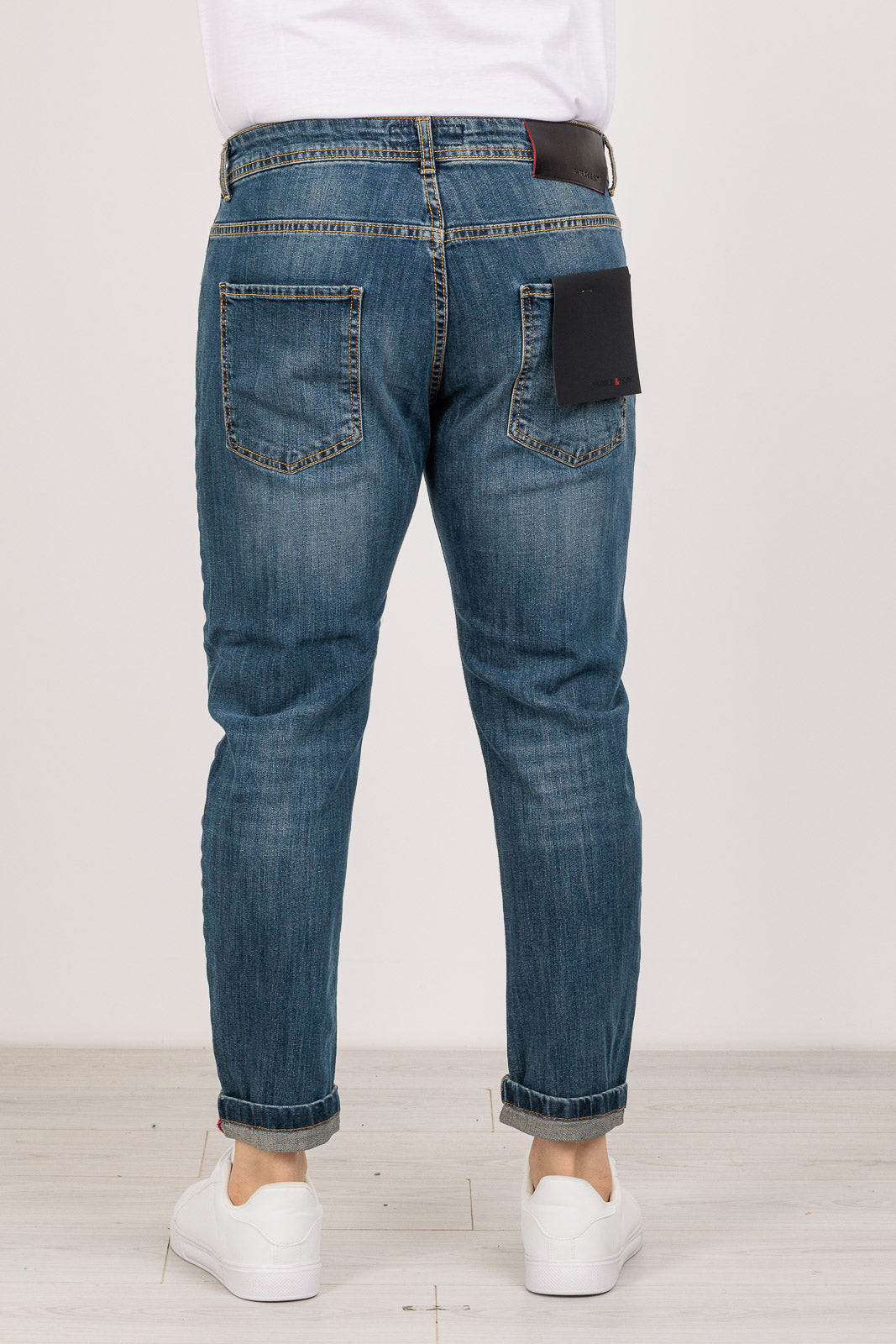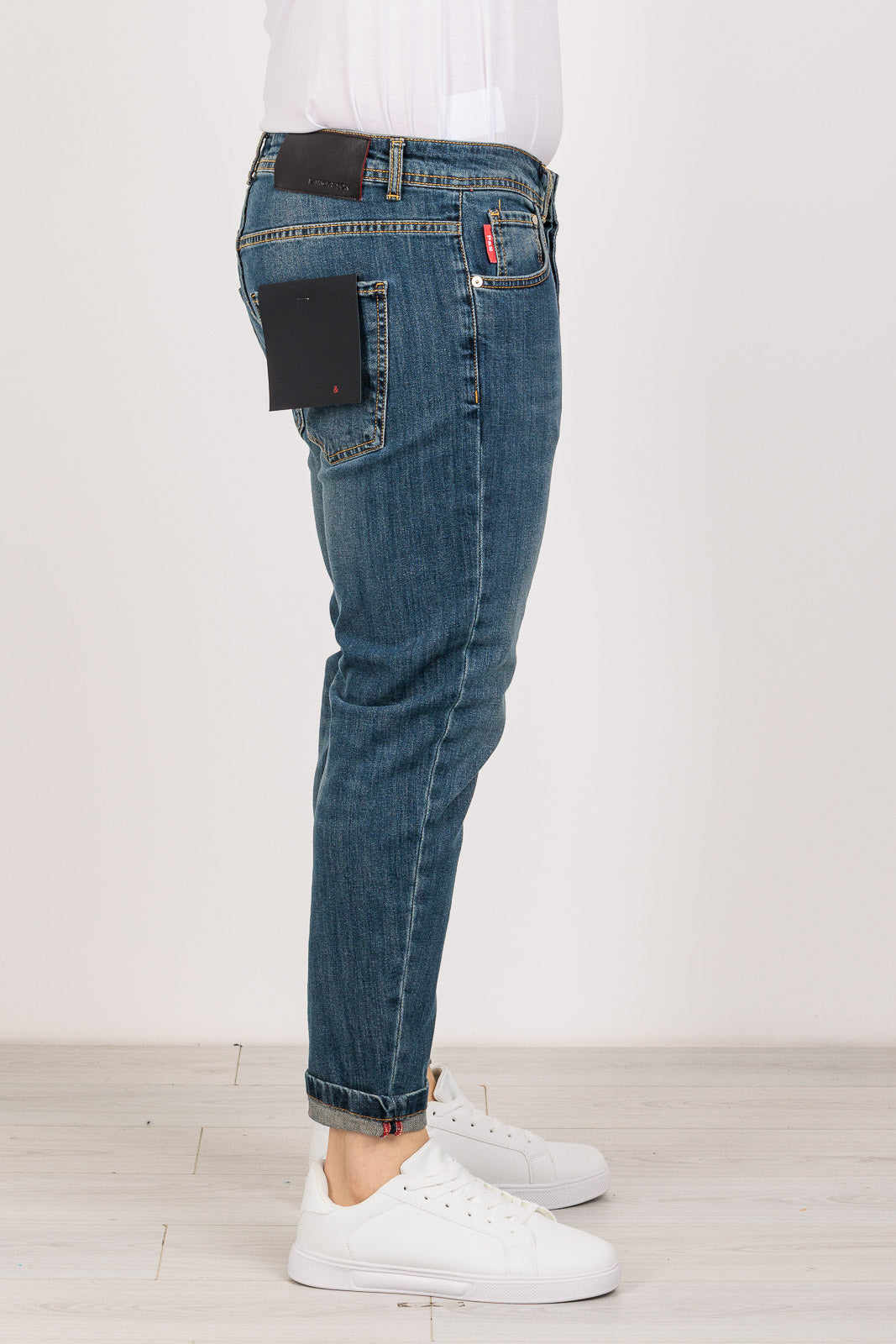 La sabbiatura non è solo un dettaglio estetico: il processo rende la fibra di cotone incredibilmente morbida e piacevole sulla pelle, eliminando la rigidità tipica del jeans nuovo. La presenza del 3% di elastan garantisce un effetto "memoria" che impedisce al pantalone di sformarsi sulle ginocchia, mantenendo il taglio slim impeccabile per tutto il giorno. La salpa posteriore in cuoio invecchiato aggiunge quel tocco finale di artigianalità italiana.