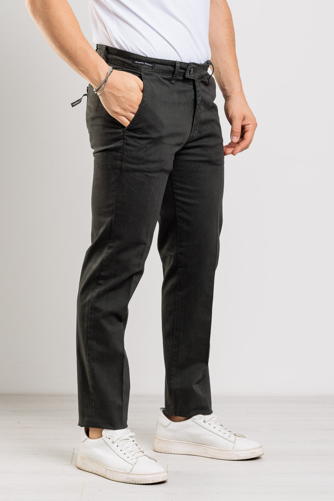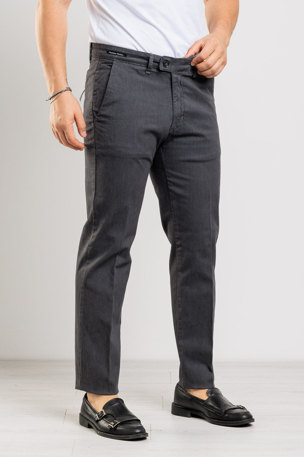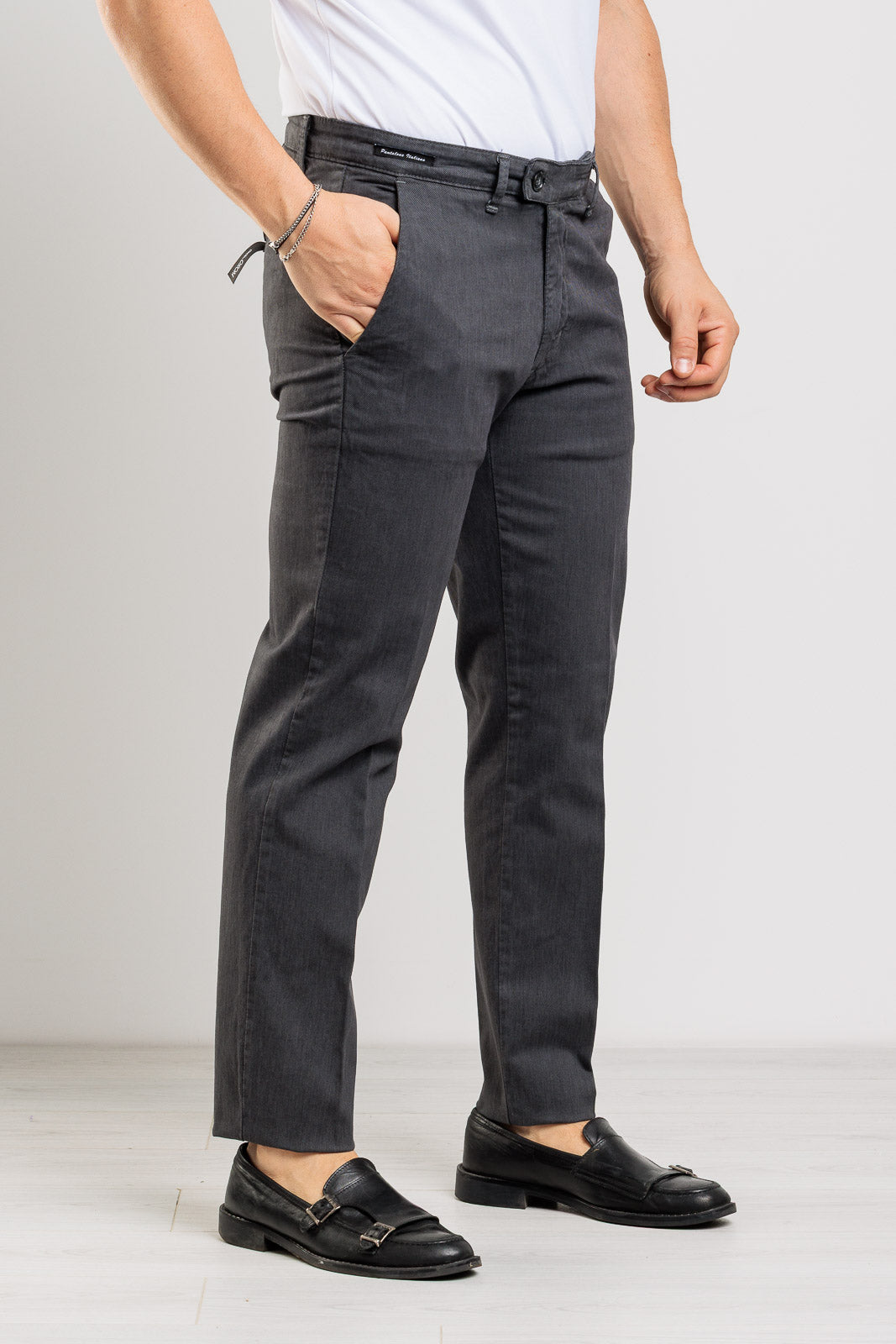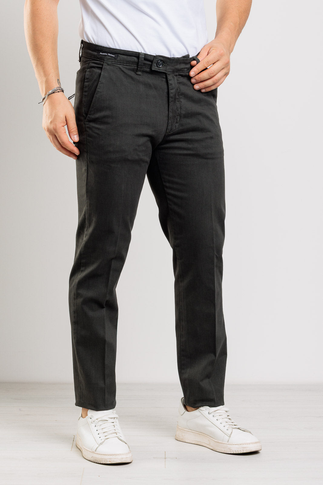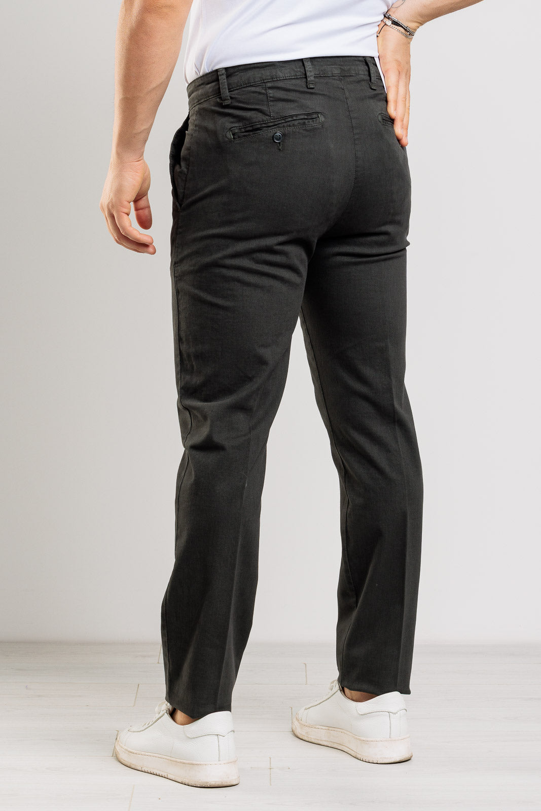 Un pantalone uomo, modello Chino, che unisce l'eleganza casual alla qualità sartoriale del Made in Italy. Questo capo in tinta unita è realizzato in pregiato cotone tinto in filo, una lavorazione che conferisce al tessuto una profondità di colore e una resistenza eccezionali. Presenta l'intramontabile tasca America sul davanti e una chiusura classica con zip e bottoni. La vestibilità slim comfort assicura una silhouette moderna che valorizza la figura senza stringere, garantendo libertà di movimento per tutto il giorno.